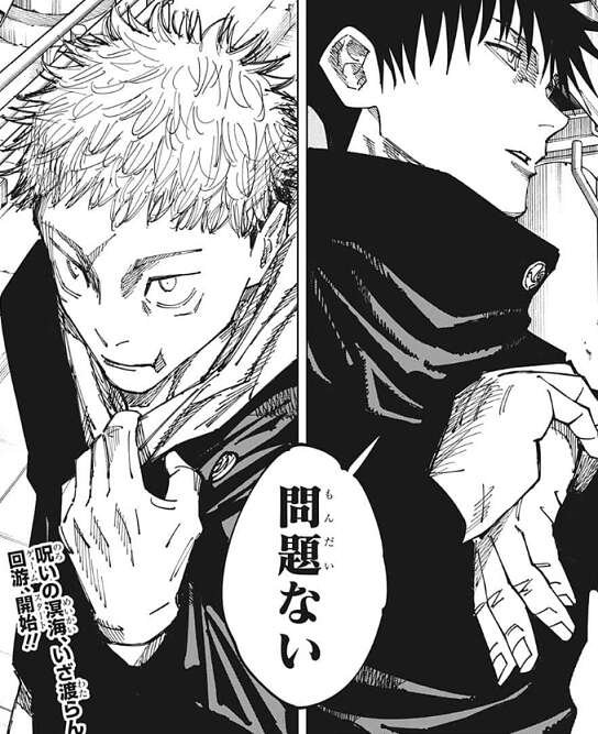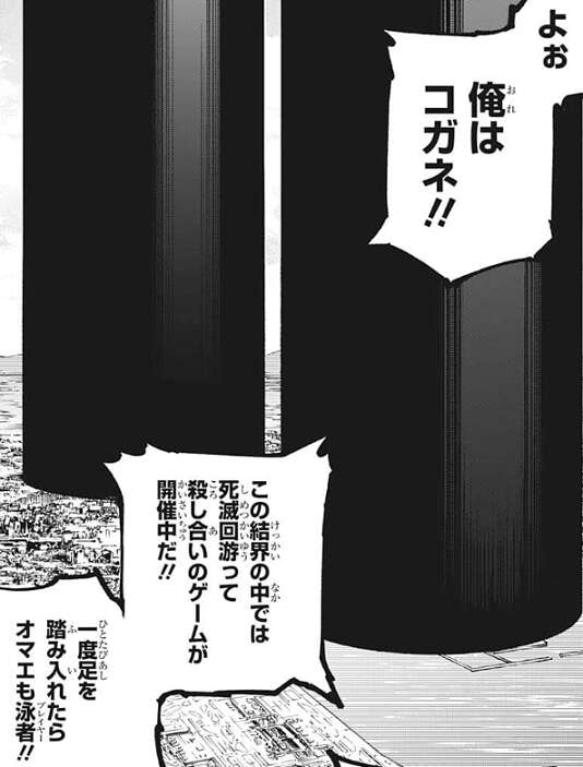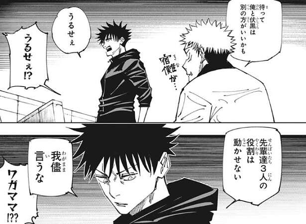 虎杖は宿儺の存在が気になり、伏黒とは別の結界(コロニー)の方がいいかも、と言いますが、伏黒は、うるせぇ、我儘言うな、と虎杖を黙らせようとし、虎杖と伏黒はにらみ合いを始めてしまいます。