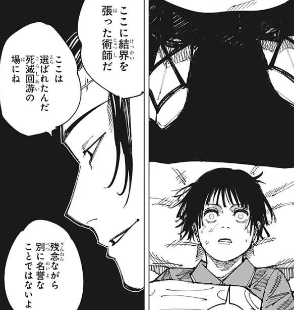 少し離れた所に刑場跡があり、そこが結界の中心で半径5.6キロだと、羂索は説明を続けます。そして、はじめから結界の内側にいる君達には結界を出る権利が一度だけある、と言い、佐々木が望めば目が覚めたら結界の外だと、羂索は言いどうするか佐々木に質問します。佐々木は、これは夢なの……?と、羂索に聞くと、夢と現実の間、呪(まじない)さ、と羂索は佐々木に答えます。