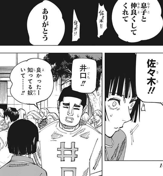 日時は11月1日 6時2分で、黒い結界は仙台結界(コロニー)のようです。佐々木と井口は仙台結界(コロニー)を眺めながら、羂索の話をします。どうやら井口をはじめ、他の人達の夢の中にも羂索は現れたようで、ロン毛の袈裟の男との話を皆しているようです。ただ井口は羂索から、息子と仲良くしてくれてありがとう、という類の話はされていないようです。その話を井口にしながら、佐々木は虎杖の事を思い出します。