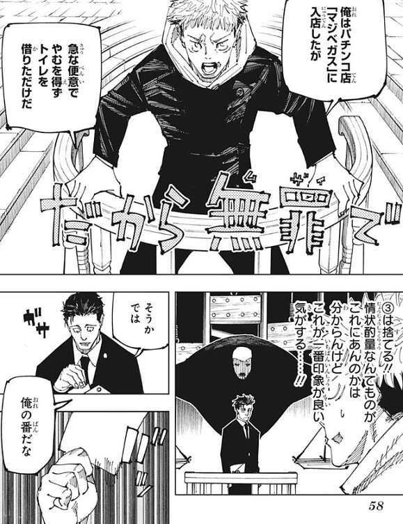 そして出した結論はパチンコ店「マジベガス」への入店は認めるが、急な便意でやむを得ずトイレを借りただけ、という②の言い訳を虎杖は選択します。証拠の中身が入店のみを裏付けるものと推測し、トイレを言い訳にして無罪を勝ち取ろうとする作戦です。