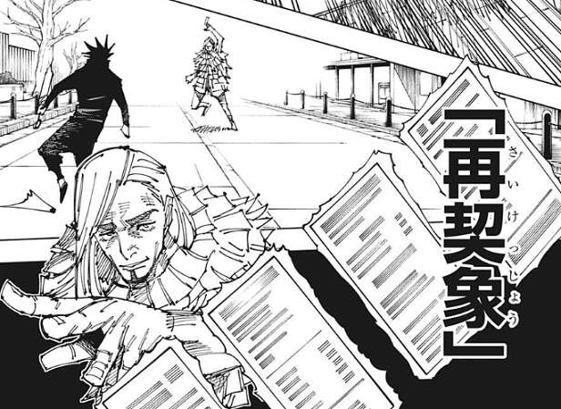 脱兎はネットに捕まりますが、伏黒はネットをかわしてレジィと再び対峙します。するとレジィはレシートを数枚取り出し、術式「再契象」を使用するとレシートは刃物に変わり、伏黒や襲い掛かります。伏黒は刃物を武器で撃ち落とし、他の刃物は脱兎で防ぎます。
