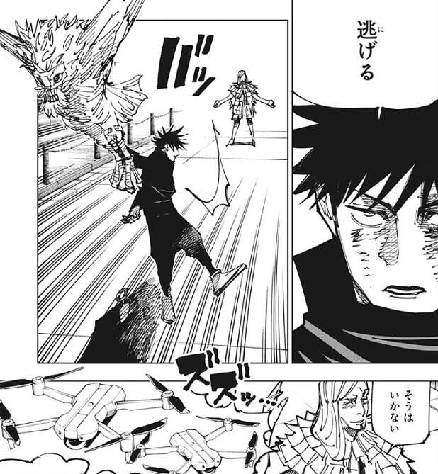 それに比べて伏黒は先の戦闘で負傷、複数の式神の併用でヘロヘロだとレジィは言い、一度傷つけられた式神は出したり消したりは出来ないから、走・攻・守揃った犬を今は出せない、そのせいで一芸の式神を併用せざるを得なくなってる、とレジィは伏黒に指摘します。お互い出力の高い大技を持たない消耗戦だから、伏黒ではレジィは殺せない、とレジィが更に指摘すると、伏黒は逃げると言うと鵺を呼び出して、飛んで逃走しようとします。