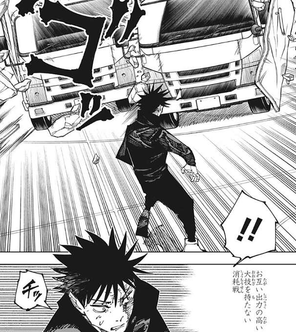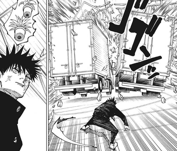 総合体育館の中に逃げ込んだ伏黒は、イメージ通りのちょうどいい広さだ……、と心の中でつぶやきながら総合体育館の中の広さを確認していると、レジィが現れます。先ほど、お互い出力の高い大技を持たない、とレジィが言っていましたが、レジィは嘘をついていたようで、体育館の外から二台の大型トラックが突っ込んできて、伏黒に向かって襲い掛かります。