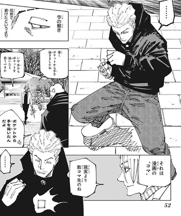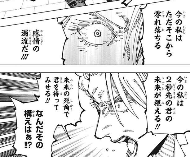秤は自分の体に現れた漫画の“コマ”を無視して、シャルルに蹴りを入れようとしますが、シャルルは難なく蹴りをかわします。秤はシャルルが反射で蹴りを避けたというより、あらかじめ蹴りが来ることを予測して避けたように見えたと感じます。すると、シャルルは秤の体に現れたのは、現実より数コマ先の漫画の“コマ”だと秤に自分の術式を説明します。