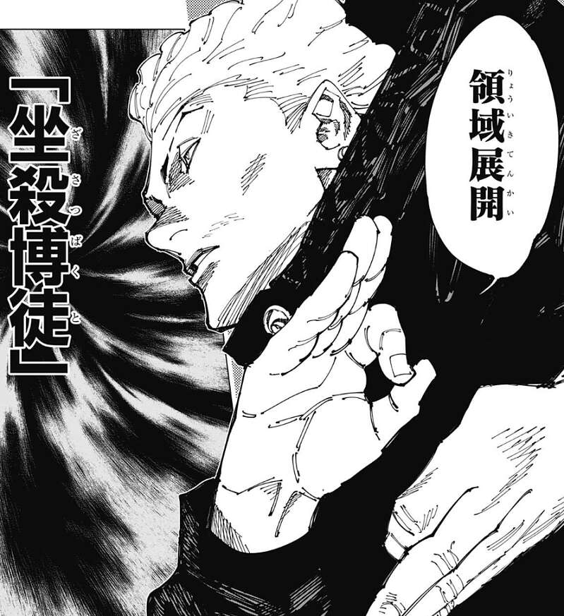 先ほどのシャルルの言っていた構えとは、秤が領域展開を繰り出そうとしている構えの事でした。秤が領域展開「坐殺博徒」を使用すると、必中効果により秤の領域と術式のルールがシャルルの脳内に開示されます。