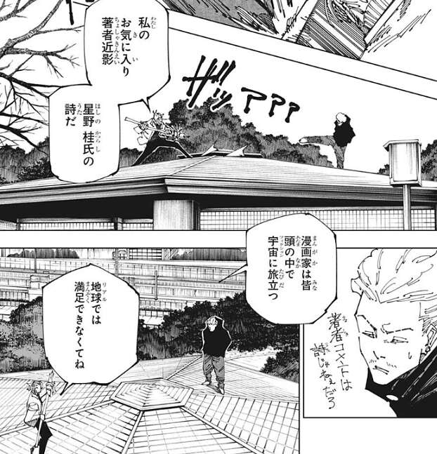 シャルルはG戦杖で秤を攻撃しつつ、お気に入り著者近影、星野桂氏のコメントを突然、読み上げ始めます。そして、私の現実(リアル)には呪術(フィクション)が降りてきてしまった、とシャルルは言うと、さらにG戦杖で秤をさらに攻撃します。