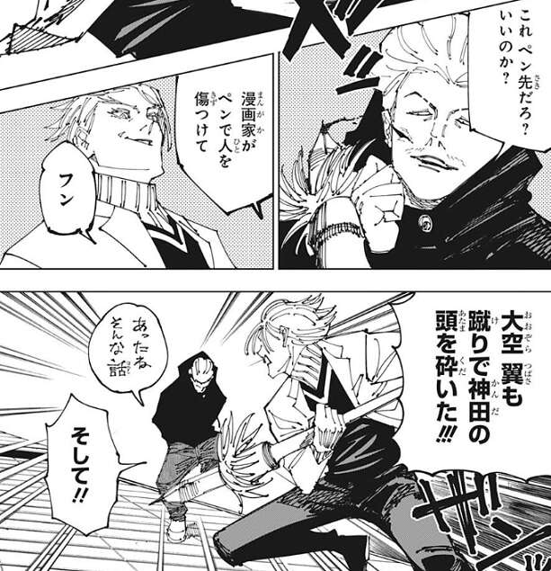 秤が、これ ペン先だろ?いいのか?漫画家がペンで人を傷つけて、と質問しますがシャルルは鼻で笑い、大空 翼も蹴りで神田の頭を砕いた!!!と、シャルルは言い、お構いなしに秤を攻撃します。