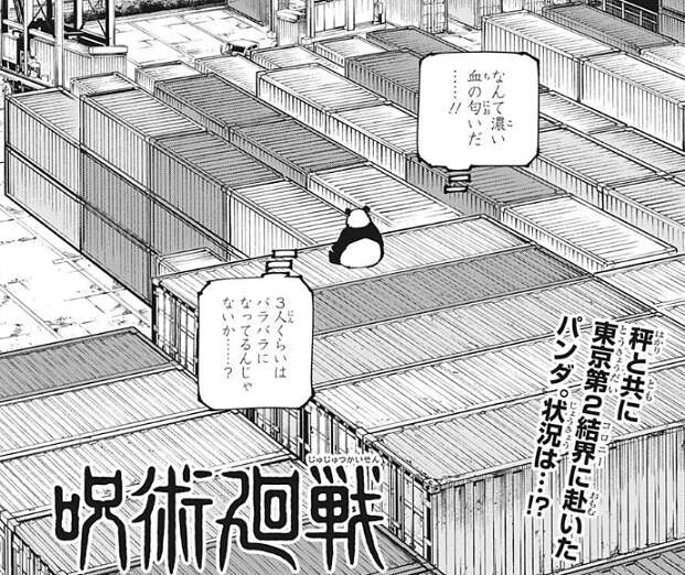 前回の秤とシャルルの戦闘から、同じ東京第2結界(コロニー)にいるパンダが転送された場所へと場面は移ります。パンダのいる場所は濃い血の匂いがしていて、パンダは警戒してテディベアの振りをして様子を伺います。