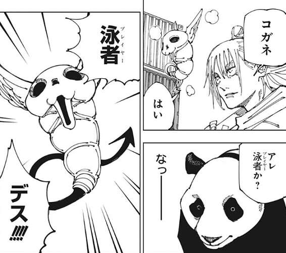 この濃い血の匂いがする状況を作った本人の呪力は微妙で、パンダはこの状況を作った者を見つけられずにいました。秤金次に戦闘は任せて、パンダ自身は“天使”の捜索と交渉に専念するつもりでいましたが、ランダム転送によって秤金次と引き剥がされてしまいました。パンダは本物のパンダの動きを真似て、気付かれないようにこの場所を離れようとします。