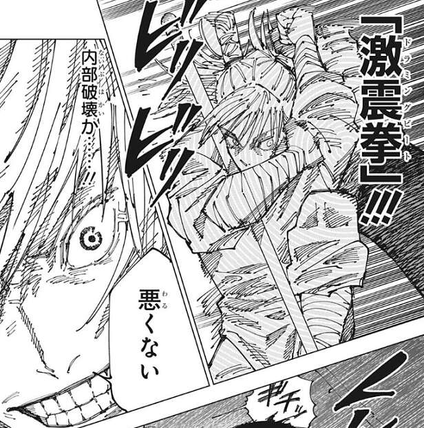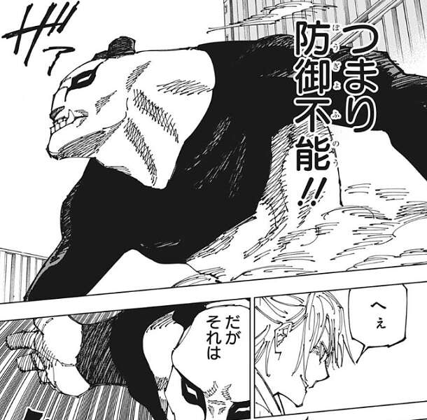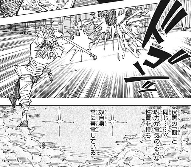 鹿紫雲一のパンチはとんでもなく速く、そして重いですが、それだけでなく伏黒の「鵺」と同じく呪力が電気のような性質を持っていて、鹿紫雲一自身は常に帯電している形で、防御不能です。