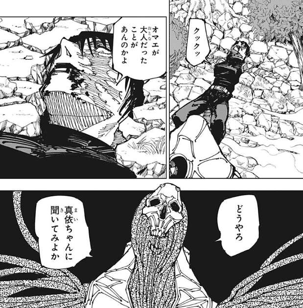 真希はそんな直哉に、オマエが大人だったことがあんのかよ、と言い返しますが、真依ちゃんに聞いてみよか?と、直哉は真依の名前を口にして真希を煽ります。真依の名前を出されて真希は激怒し、体を起こして直哉を攻撃しようとします。