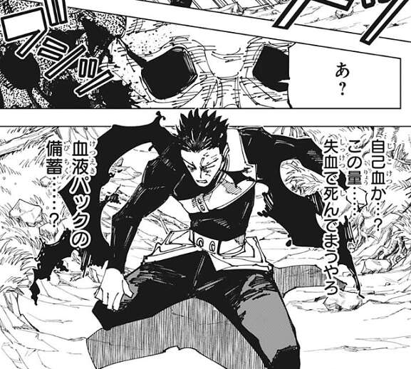 さらに加茂憲紀は赤血躁術で直哉を攻撃し、直哉はダメージを負います。直哉は加茂憲紀が大量の血を使って攻撃してきたことに、この量……失血で死んでまうやろ、と驚きます。