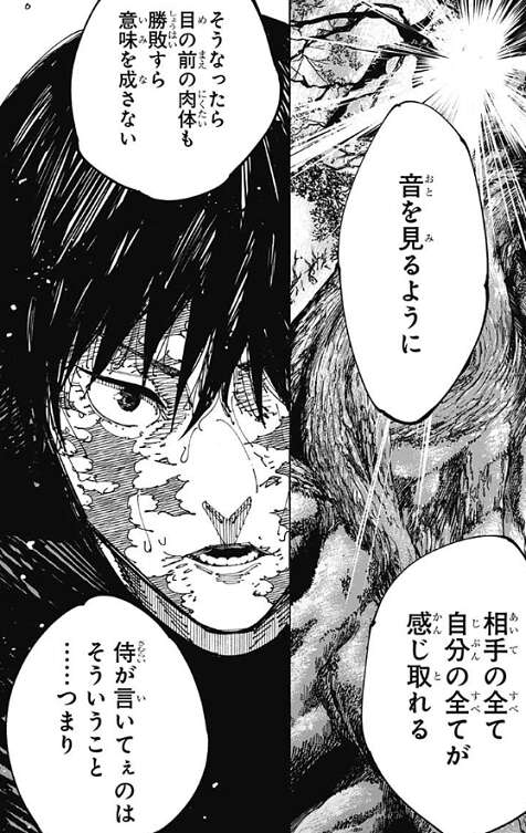 さらに真希は相撲を取りながら語り続け、相撲でぶつかり合った瞬間、相手の全て、自分の全てが感じ取れる、そうなったら目の前の肉体も勝敗すらも意味を成さない、侍が言いてぇのはそういうこと、と三代は侍の言っている意味を真希に伝えます。