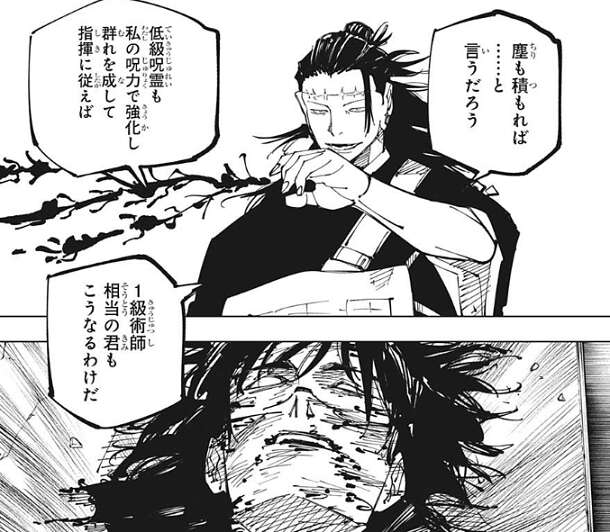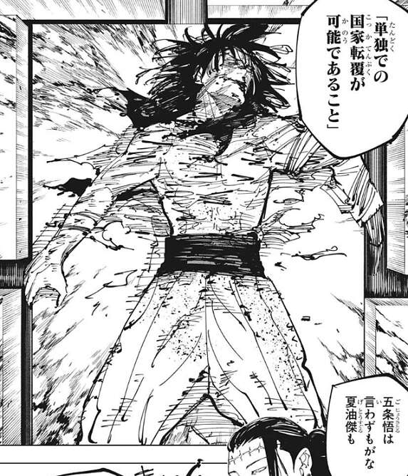 黒い呪霊の群れをまともにくらってしまい、吹き飛ばされた脹相は立ち上がることが出来ないほどのダメージを負ってしまいます。吹き飛ばされた脹相に羂索は、術師の“特級”が何を意味するか知っているかい?と、問いかけます。「単独での国家転覆が可能であること」と羂索は自分で言うと、五条里悟は言わずもがな、夏油傑も呪霊操術で異形の軍隊を持つことができる、と説明します。