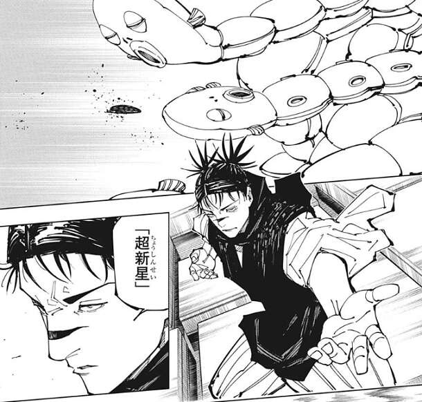 しかし、脹相は多数の呪霊にも慌てず「超新星」を使って、多数の呪霊を撃破します。その隙に羂索が距離を詰めてきて、近距離戦を仕掛けてきます。羂索に殴られ脹相は一瞬ひるみますが、羂索にさらに超新星を使って羂索を攻撃します。しかし、この超新星も羂索は呪霊で防ぎ、羂索はダメージを負っていません。
