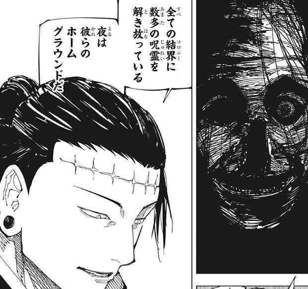 全ての結界(コロニー)に数多の呪霊を解き放っている、夜は彼らのホームグランドだ、と羂索は言います。羂索が軍を夜に行動させたのは、軍人にアドバンテージを与える為でなく、呪霊が活発に動く夜に軍人を行動させ、軍人を呪霊に遭遇させる為でした。
