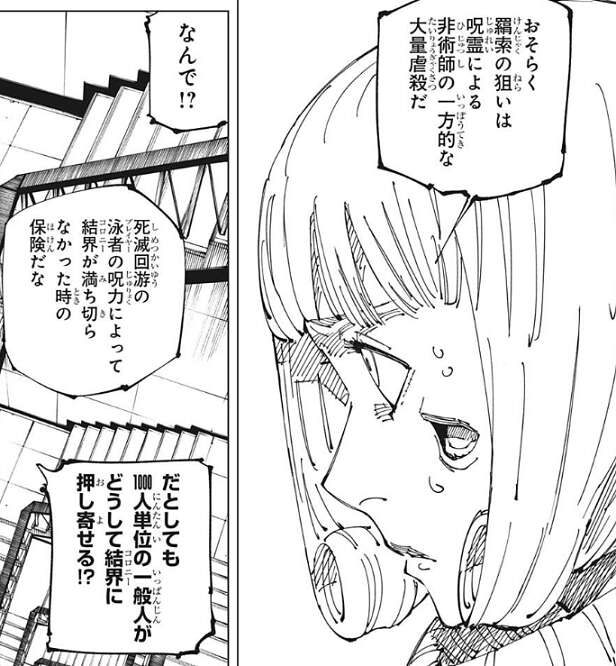 虎杖達がホテル内を移動している場面に移り、羂索の狙いが呪霊による非術師の一方的な大量虐殺だ、と天使は推測します。死滅回游のプレイヤーの呪力によって結界(コロニー)が満ち切らなかった時の保険だな、と天使は冷静に分析しますが、虎杖達はこの時点では非術師が軍人とは知らないので、1000人単位の一般人が結界(コロニー)に突入したことに混乱します。その間にも軍人達は虎杖達に接近し、虎杖達に対してスタングレネードを投げます。