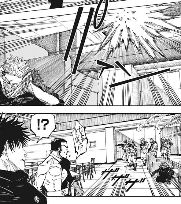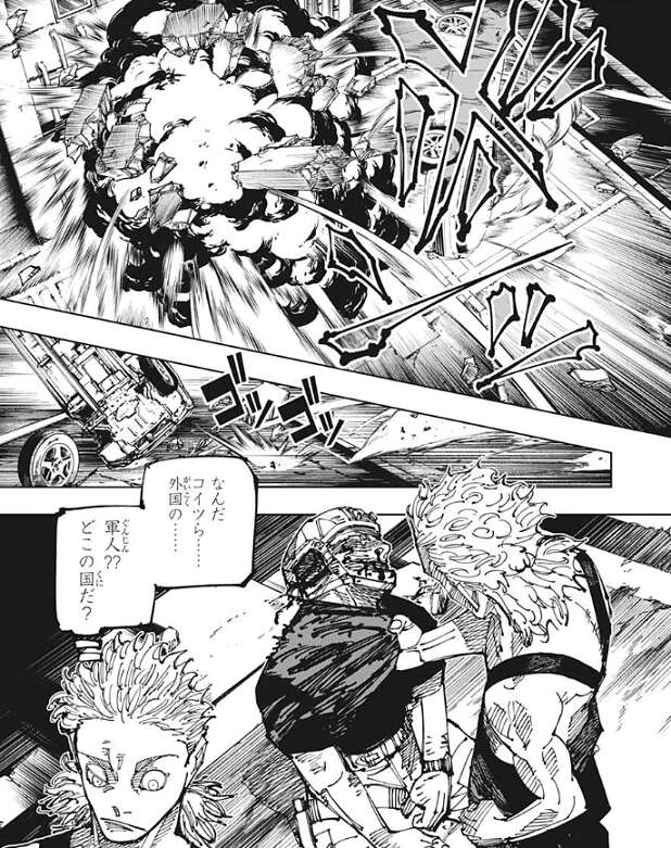 虎杖はスタングレネードを蹴り返し、スタングレネードは天井の辺りで爆発しますが、スタングレネードが虎杖達のそばで爆発しなかったと分かると、軍人達は銃を構えて虎杖達を攻撃しようとします。
