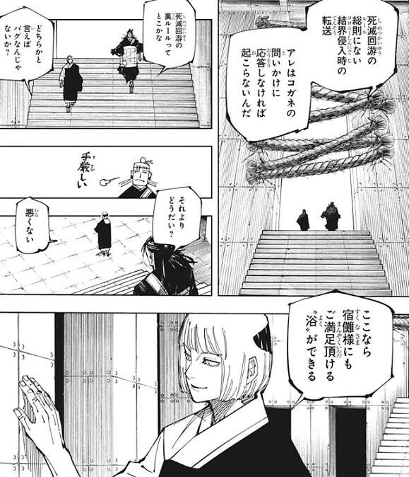 羂索はこれを死滅回游の裏ルールと表現しますが、裏梅は、どちらかと言えばバグなんじゃないか?と、手厳しいです。裏梅は羂索に案内された場所を見て、ここなら宿儺様にも満足頂ける“浴”ができる、と満足気です。裏梅が言っている“浴”がどんなものか不明ですが、この場所は真希と父親の扇が戦った忌庫のように見えます。
