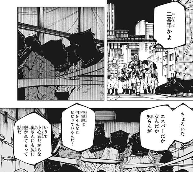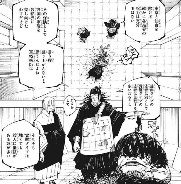 一方、場面は羂索と裏梅との会話に戻り裏梅は、死滅回游のプレイヤーに武装した非術師……軍人を当てることで、結界(コロニー)の呪力を活性化させ天元との同化前の慣らしを終える、と羂索に言い、羂索の考えを推測しますが、それだけだと60点だと羂索は言います。羂索は東京と仙台を除けば各結界(コロニー)の呪力は十分でないと言い、その保険として軍隊を各結界(コロニー)に差し向けたようですが、軍VS術師は言う程盛り上がらないと思う、と羂索は言います。覚醒タイプのプレイヤーは苦戦する者も多いだろうし、覚醒タイプは強くても殺人に抵抗がある奴が多い、と羂索は話し、ある程度の被害を受けたら軍も引くだろう、と羂索は推測します。