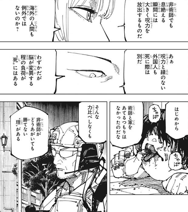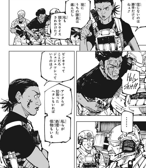 新たな軍人のグループのリーダーは女性の軍人で、女性の軍人は呪術師もピンキリだと言い、女性の軍人が対応した呪術師は生け捕りでなく殺してしまったようです。女性の軍人は、グレネードの効果が薄かった上、テーザーガンも50口径の弾も通用しなかったので、仕方がないと言います。さらに、頭がヘリになる化け物だったと言い、うちの隊員も傷を負った、自分達が処理した怪物以上の呪術師もいるはず、と仲間の軍人達に警告します。この女性の軍人は頭がプロペラになる呪術師と戦ったようなので、おそらくこの殺された呪術師は虎杖が19巻の第162話で戦った羽場だと思われます。