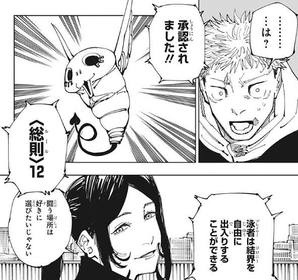 そして場面は戻り、津美紀がプレイヤーの結界(コロニー)の出入りを可能にするルールを追加します。このルールはコガネに承認され、<総則(ルール)>12として追加されます。津美紀は、闘う場所は好きに選びたいじゃない、と伏黒に言います。