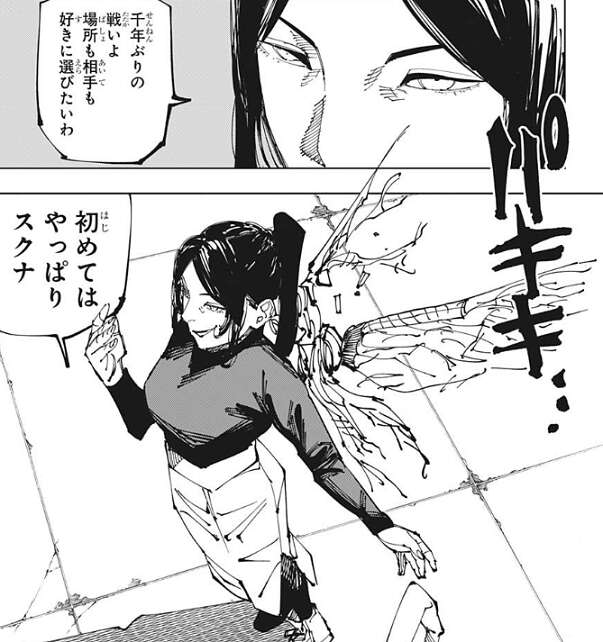 伏黒は、なんで………!今まで!!と、驚愕しながら問いかけますが、あなた達が勝手に説明したんでしょう?と、万は答えます。そして、千年ぶりの戦いよ、場所も相手も好きに選びたいわ、と万は言うと、初めてはやっぱりスクナ、と言いながら背中に羽を作り出します。そして、じゃあね待ってるわよ、と万は言うと、羽を使ってどこかに飛び立ってしまいます。待っているわよ、と伏黒達(特に虎杖に言った?)に言ったことから、虎杖が宿儺の器という事が万には分かっているようにも見えます。