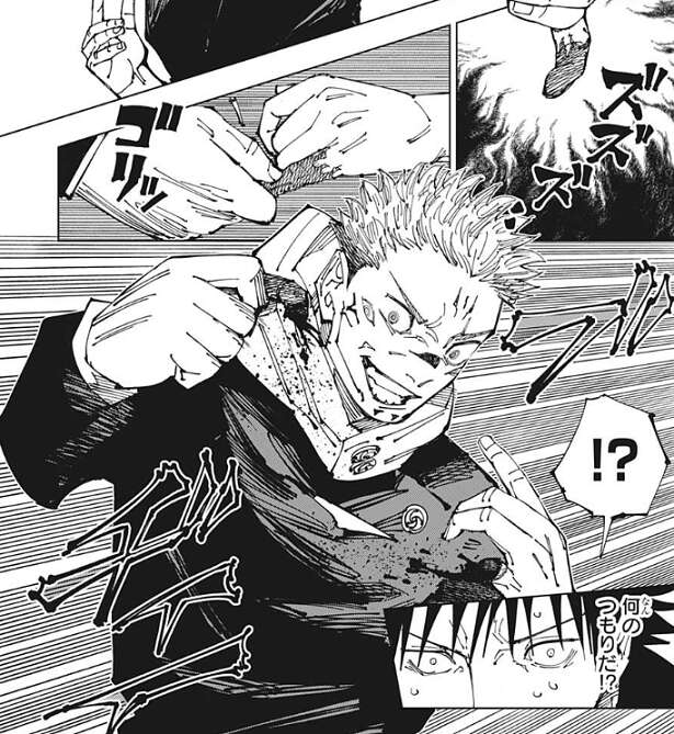 しかし、宿儺は一瞬で距離を詰めると伏黒の手を取って掌印を結ばせないようにし、強引に伏黒の口を開かせます。そして、宿儺はちぎり取った指を伏黒の口に入れて、強引に飲み込ませます。