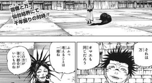 禪院家へと戻った宿儺や裏梅は、宿儺が行おうとしている浴の準備を始めます。裏梅が浴の準備をしている間、羂索は死滅回游を終わらせようとしている事を裏梅に話します。羂索の目的である「天元と人間の重複同化」は、死滅回游を終わらせないと実行できない、と羂索は裏梅に言います。そして、“永続するゲームを終わらせる”という無理難題の縛りを羂索自身にかけることで、死滅回游と言う理不尽なゲームを成立させていたようで、これをどうやって終わらせるかは、ここでは羂索は話しません。それより羂索は浴に興味があるようです。
