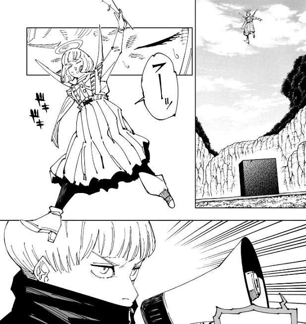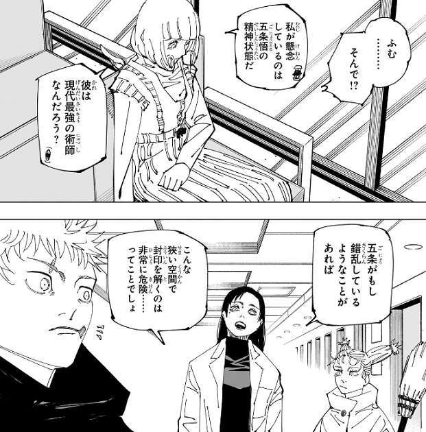 獄門疆の中では物理的時間は流れていないので、ハロウィンからの19日間を五条がどう感じたかを天使は危惧します。もしかしたら、一瞬のように感じているかもしれないし、逆に100年以上待ちぼうけをくらっている状態かもしれない、と天使は言います。天使は五条の精神状態を懸念していて、五条がもし錯乱しているようなことがあれば、こんな狭い空間で封印を解くのは非常に危険……、と家入が天使の考えを代弁します。虎杖や秤も、それは確かにデンジャラスだな、という事で封印を解く場所を移動することにします。
