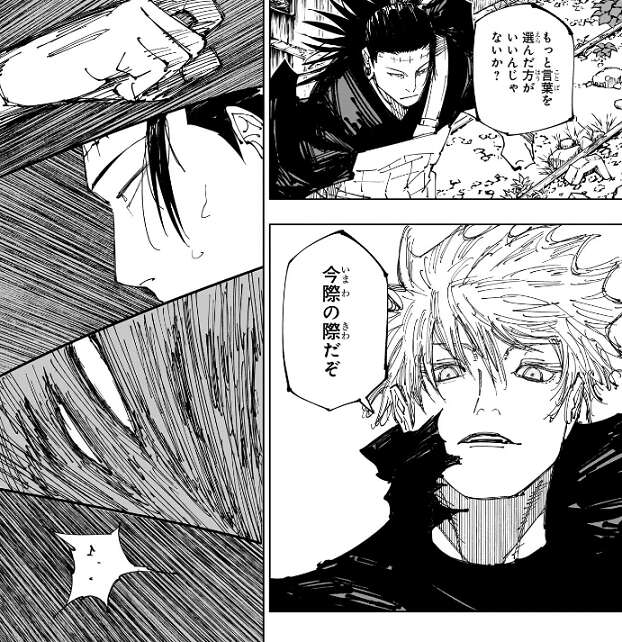 どう?久しぶり?お寛ぎ頂けたかな?と、羂索はふざけて見せますが、激怒している五条は、もっと言葉を選んだ方がいいんじゃないか?今際の際だぞ、と言うと、いきなり羂索を攻撃します。五条はおそらく無下限呪術で羂索を攻撃し、羂索は防戦一方です。