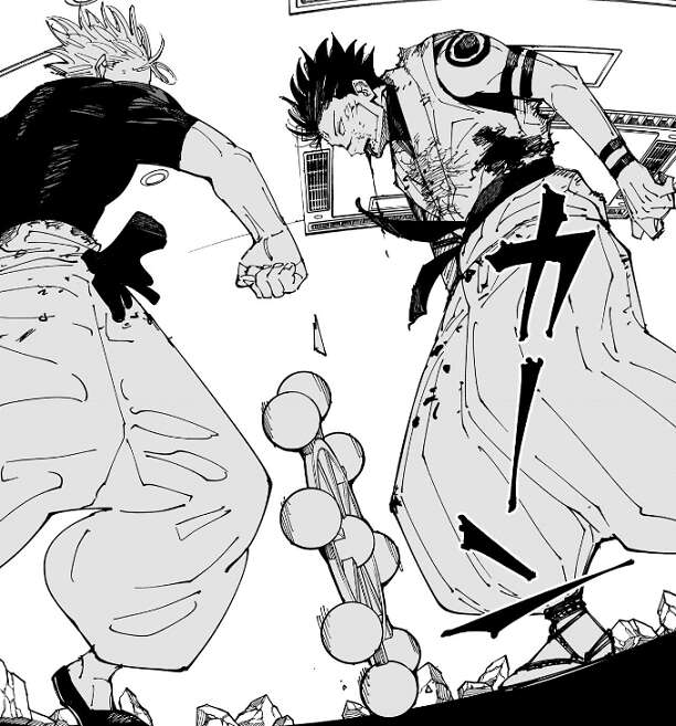 宿儺は術式順転「蒼」の攻撃を全て避けますが、五条は宿儺に近づき蹴りをくらわせます。宿儺はダメージを負いますが、致命傷を与える事は出来ません。