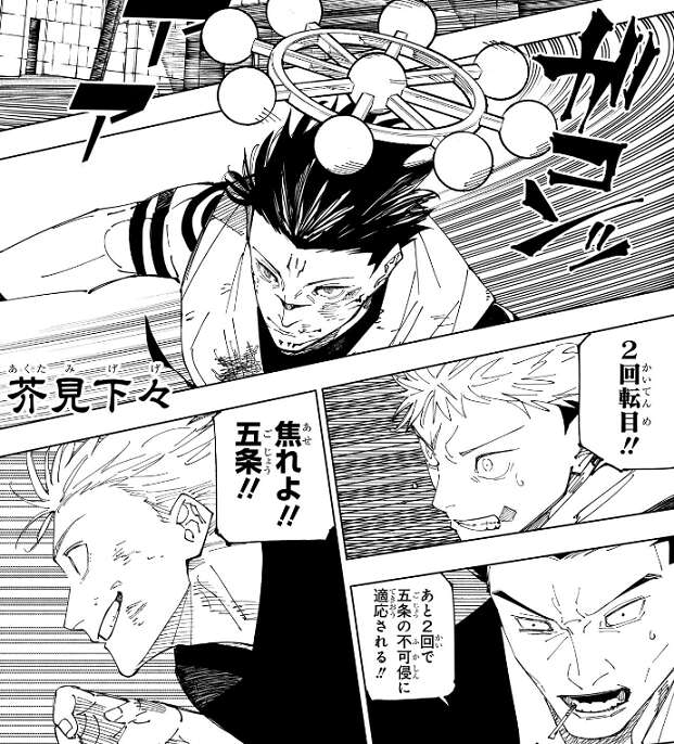 宿儺の頭上にある法陣が回転し、魔虚羅が無下限呪術に適応するまで後、2回転という状況になります。モニターで戦闘を見ている日下部は、焦れよと五条に叫びます。