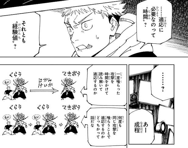 その間に法陣がさらに回転し、3回転目となります。魔虚羅の適用まで後1回転となりますが、ここでモニターを見ていた虎杖が、適用に必要なのは“時間”なのか?それとも“経験値”なのか?と、疑問を口にします。一度喰らった攻撃を時間をかけて読み解いて適応するのか?それとも何度も同じ攻撃を喰らうことで適応するのか?どっちなのか、