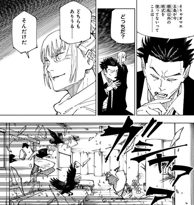 日下部はどちらなのか分かっていないようで、どっちだ?とつぶやきますが、どちらもありうる……、そんだけだ、と鹿紫雲一は答えます。結局、どっちなのか誰も分からないようです…。五条と宿儺の戦闘は続きますが、五条は「蒼」しか使っていませんでしたが、それは宿儺にそう刷り込む作戦で、このタイミングで術式反転を使います。
