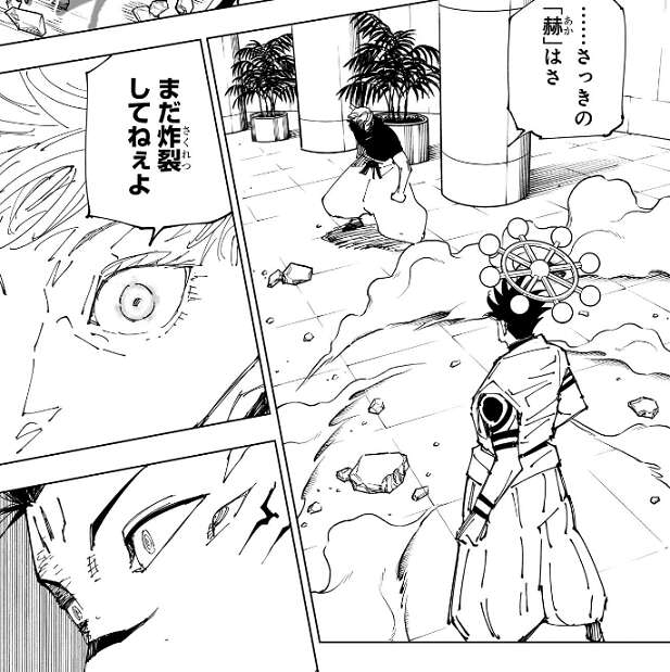 宿儺は五条の攻撃が雑だ、と煽りますが、五条はこの展開を読んでいたようで、先ほどの術式反転「赫」をまだ炸裂させていなかったようです。