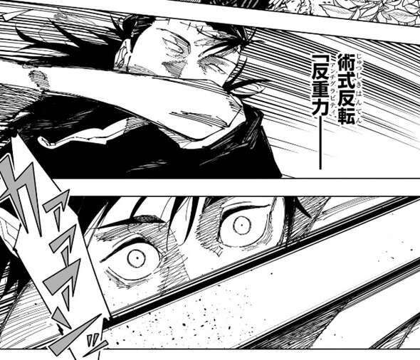 すると、いつの間にか羂索の背後に乙骨がいて刀を構えています。羂索はすぐに、術式反転「反重力機構(アンチグラビティシステム)」で対抗しようとします。