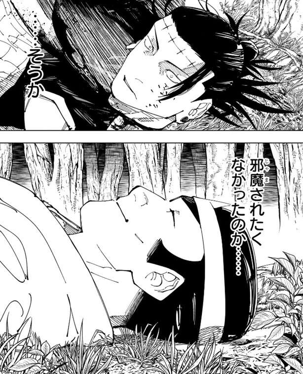 羂索は首を切り落とされてしまいますが、その事など気にもせず、初めからこのつもりだったのかと羂索は乙骨に質問します。すると、髙羽さんに人は殺せませんから、と乙骨は答えます。乙骨は最初から髙羽は人を殺せないと分かっていたようで、隙を見て参戦するつもりだったようです。道半ば……、残念だよ、羂索は言いますが、私の意思は受け継がれる、と不穏な言葉を残します。