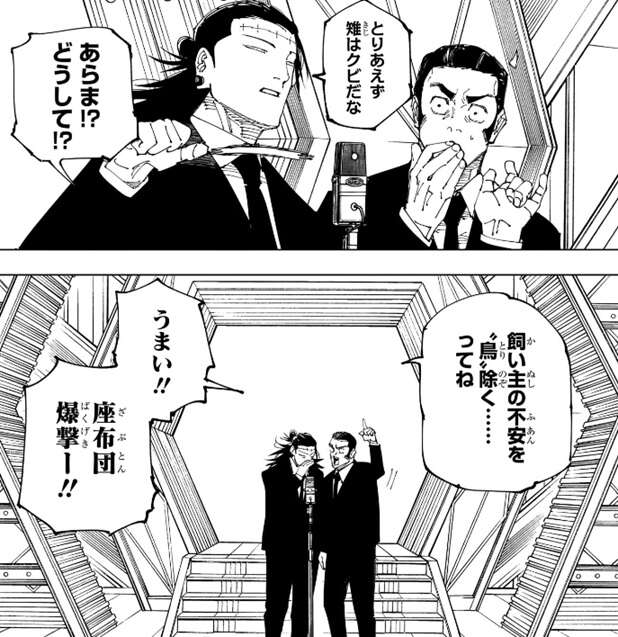 中盤までは髙羽と羂索コンビの、漫才のみが描かれています。今回の漫才で髙羽はお笑いに満足したようで、羂索の思惑通り前回、だがこのままでは私は負ける、と羂索がつぶやいていた状況の回避に成功します。