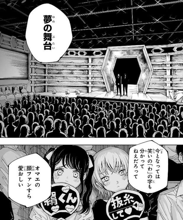夢の舞台が終わってしまうと髙羽は言い、いつの間にか羂索の顔ファンまで登場していますが、笑いを一切分かっていないだろうこの羂索の顔ファンすら愛おしい、と髙羽は言います。そして、終わりたくねぇ、終わりたくねぇよ、と髙羽と言いうっすら涙を浮かべますが、白けるだろと羂索は返事をします。