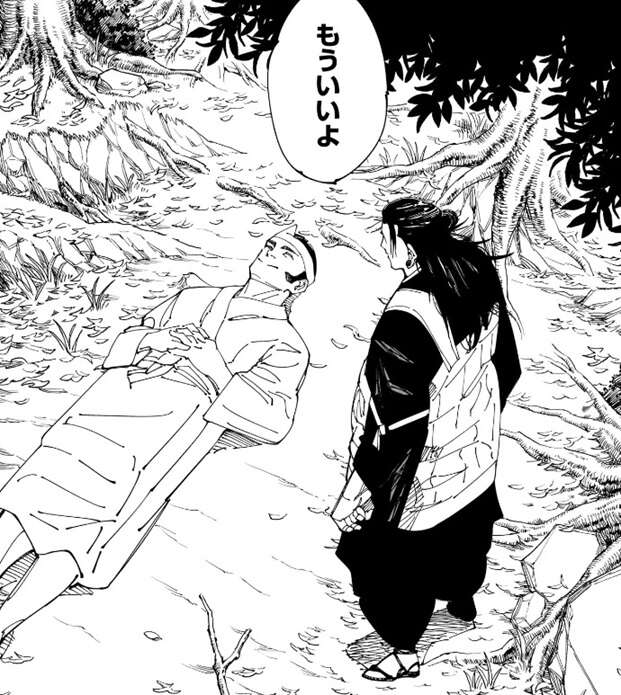 しかし乙骨が刀を抜く方が速く、乙骨は羂索の首を斬ります。