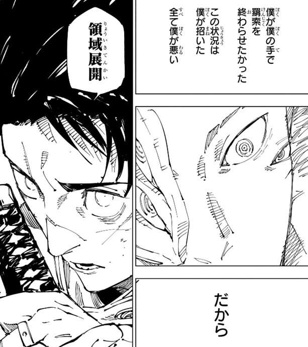 乙骨は、自分自身の手で羂索を終わらせたかったからで、やはり全て自分が悪い、と自分に言い聞かせます。しかしだからこそ、この領域内ですべて決着をつける、と乙骨は決意し、領域を展開します。