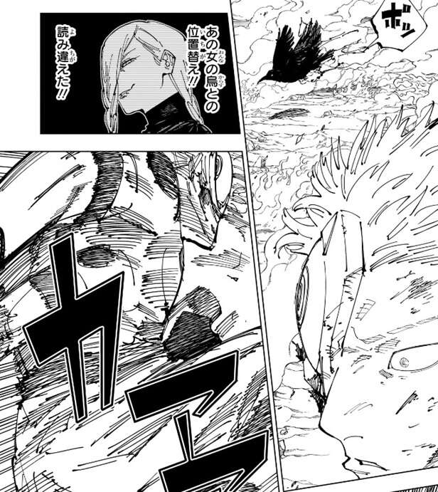 そこに冥冥の烏が現れ、宿儺は烏と虎杖の入れ替わりが発生すると直感します。宿儺は、読み間違えた!!と、考え、烏の方に体勢を向けそちらを攻撃します。そして、東堂がビブラスラップを鳴らします。
