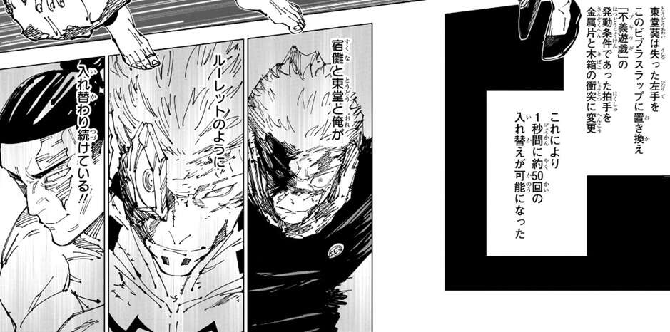 「不義遊戯」改は発動条件を拍手から金属片と木箱の衝突に変更していて、これにより1秒間に約50回の入れ替えが可能となったようです。東堂がビブラスラップを鳴らすと、宿儺と虎杖と東堂がルーレットのように次々と入れ替わり続けていきます。