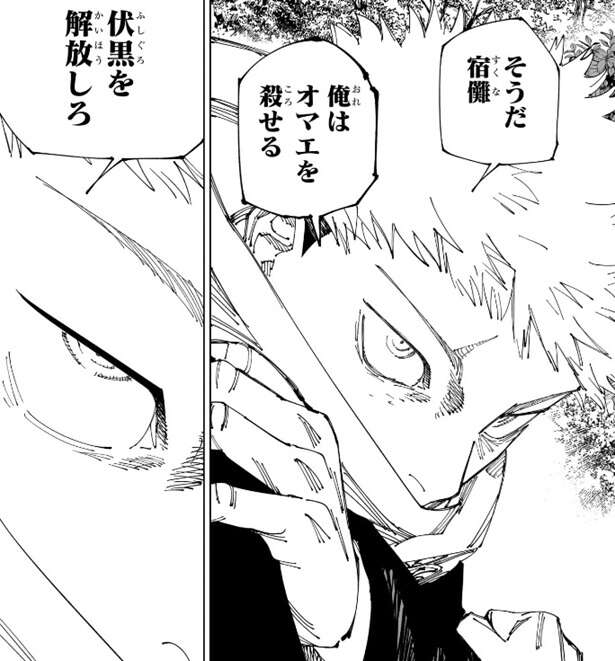 虎杖は、そうだ宿儺、俺はオマエを殺せる、伏黒を解放しろ、と言います。伏黒を解放し、もう一度虎杖の中に戻るなら、殺さないでやる、と虎杖は言いますが、宿儺は激怒します。