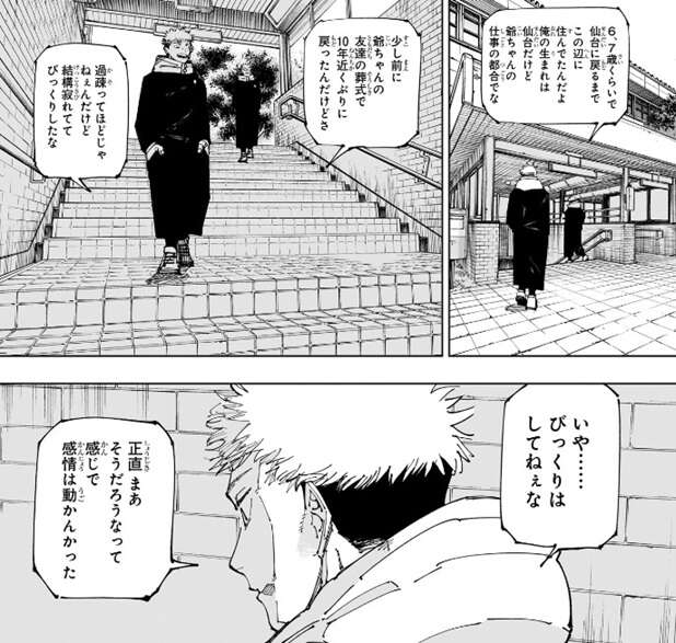 虎杖は6、7歳で仙台に戻るまで岩手県の北上駅の辺りに住んでいたようで、虎杖のお爺さんの仕事の関係だと理由を宿儺に説明します。少し前にお爺さんの友達の葬式で10年近く振りくらいにこの場所に戻ってきて、結構寂れていてびっくりした、いや……びっくりはしてない、正直まあそうなんだろうなという感じで感情は動かなかった、と虎杖はその時の心情を宿儺に話します。さらに虎杖は一番よく遊んだ公園を案内し、宿儺にその当時の事を色々話します。