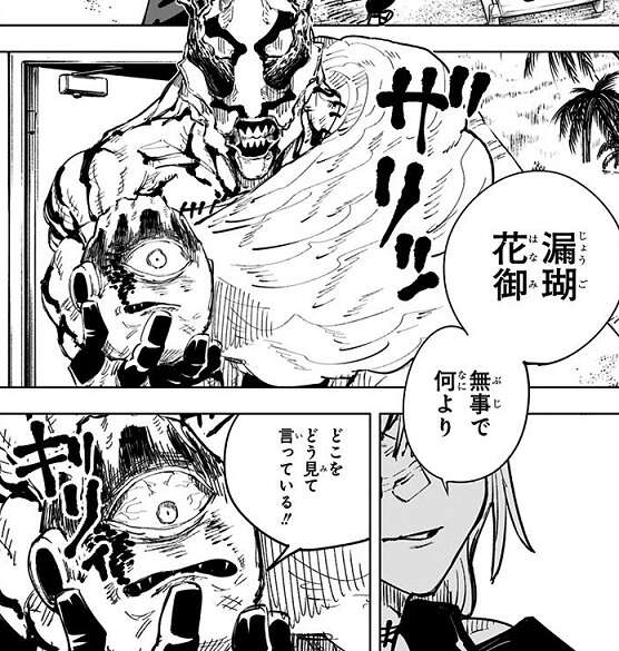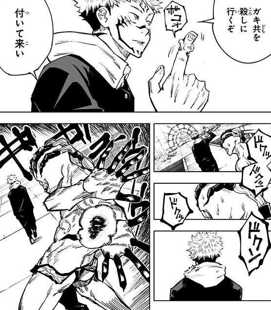 虎杖は伏黒と釘崎が脱出したことを確認すると、肉体の主導権を宿儺に渡して特級呪霊の相手をさせようとします。しかし、宿儺は虎杖の思惑通りになることを嫌がり、特級呪霊と一緒に脱出した伏黒を追おうとしますが、特級呪霊は生まれた場所を動くことを嫌がったうえ、宿儺を攻撃しようとします。