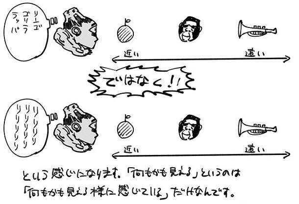 芥見下々先生直々の、無下限呪術・無量空処についての説明です。作中で漏瑚は「いつまでも情報が完結しない」と言っていましたが、絵に描くとこんな感じだそうです。「何もかも見える様に感じている」だけで、リンゴの次のゴリラの情報にたどり着けていない感じのようです。