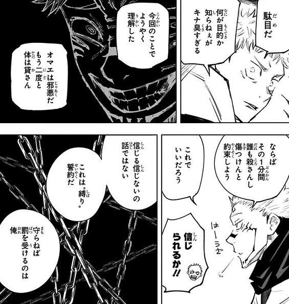 死んだはずの虎杖でしたが、なぜか宿儺の生得領域で宿儺と対峙していました。宿儺から、俺達はまだ死んでいない、と言われ、さらに条件を呑めば心臓を治し生き返らせてやる、と虎杖は言われます。虎杖は一旦宿儺の提案を拒否しますが、最終的に宿儺の縛りで生き返ることになります。