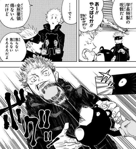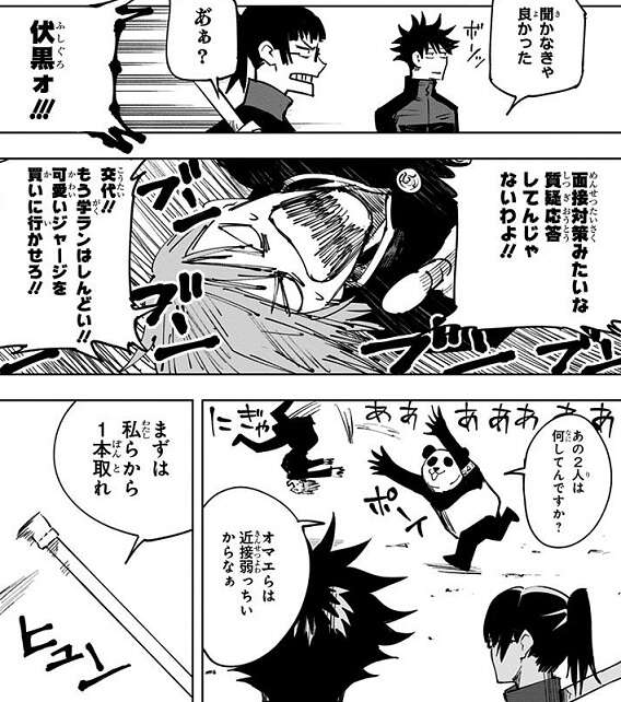 虎杖は五条の指導のもと、助力のコントロールや、呪術に関する最低限の知識を教わります。虎杖には術式がないため、呪力を鍛えることになり、その方法として五条から映画鑑賞を提案されます。一方、伏黒と釘崎は狗巻棘、禪院真希、パンダのもとで弱点の近接を鍛えることになります。